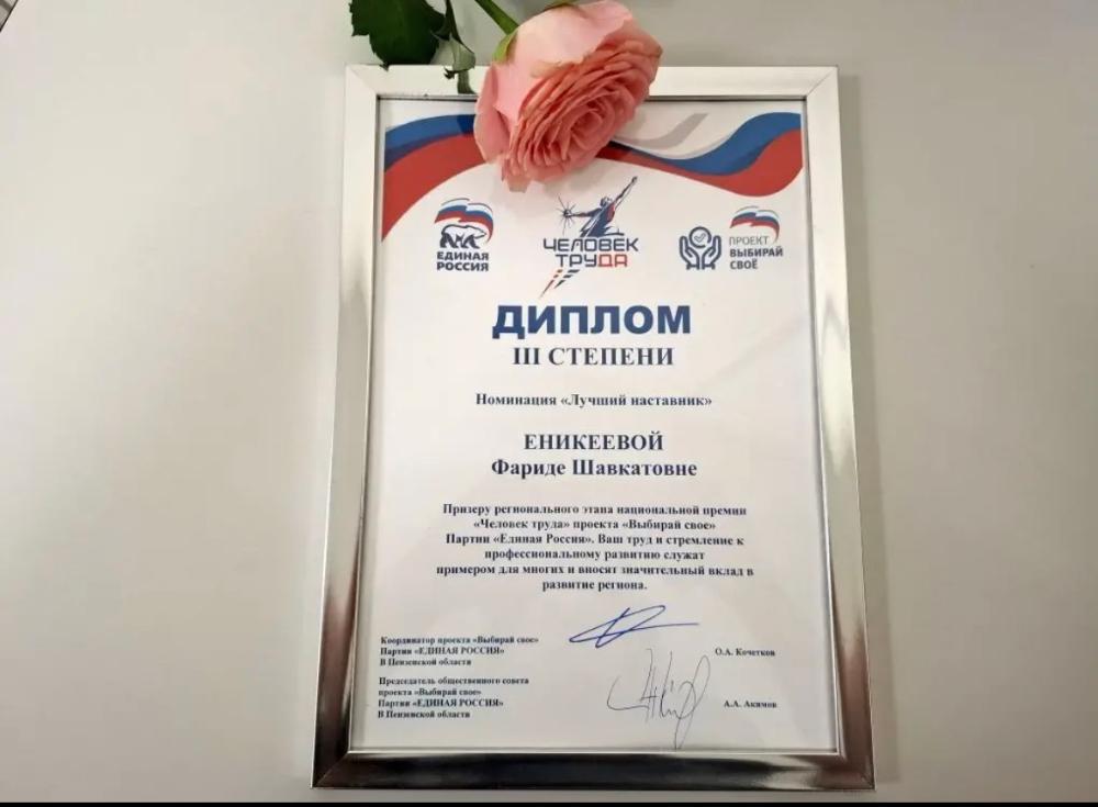 Заведующая клинико-диагностической лаборатории нашего Центра Еникеева Фарида Шавкатовна принимала участие в региональном этапе национальной премии и была отмечена дипломом III степени в номинации "Лучший наставник". Данная инициатива, реализуемая в рамках федерального проекта «Выбирай свое» Партии «Единая Россия», направлена на повышение престижа рабочих профессий, укрепление трудовых традиций и выявление лучших специалистов в различных отраслях Пензенской области.