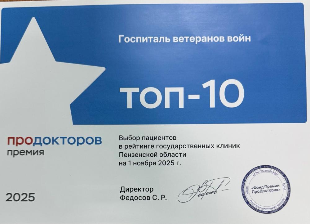 Государственное бюджетное учреждение здравоохранения «Пензенский областной госпиталь для ветеранов войн» вошел в ТОП-10 по выбору пациентов в рейтинге государственных клиник Пензенской области на 1 ноября 2025 года. Поздравляем с заслуженной наградой, ведь для нас нужды пациентов всегда на первом месте! Это новый стимул развиваться и совершенствоваться дальше!