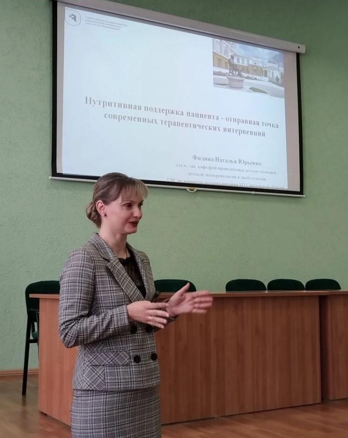 С докладом " Нутритивная поддержка пациента- отправная точка современных терапевтических интервенций в паллиативной помощи" выступила главный внештатный специалист паллиативной помощи детскому населению Министерства здравоохранения Саратовской области,д.м.н., заведующий кафедрой пропедевтики детских болезней, детской эндокринологии и диабетологии ФГБОУ ВО Саратовский ГМУ им. Разумовского Филина Н.Ю.