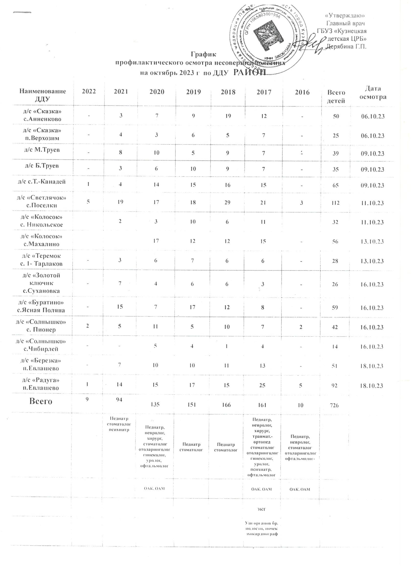 - График профилактических осмотров несовершеннолетних в детских дошкольных учреждениях Кузнецкого района в 2023 году