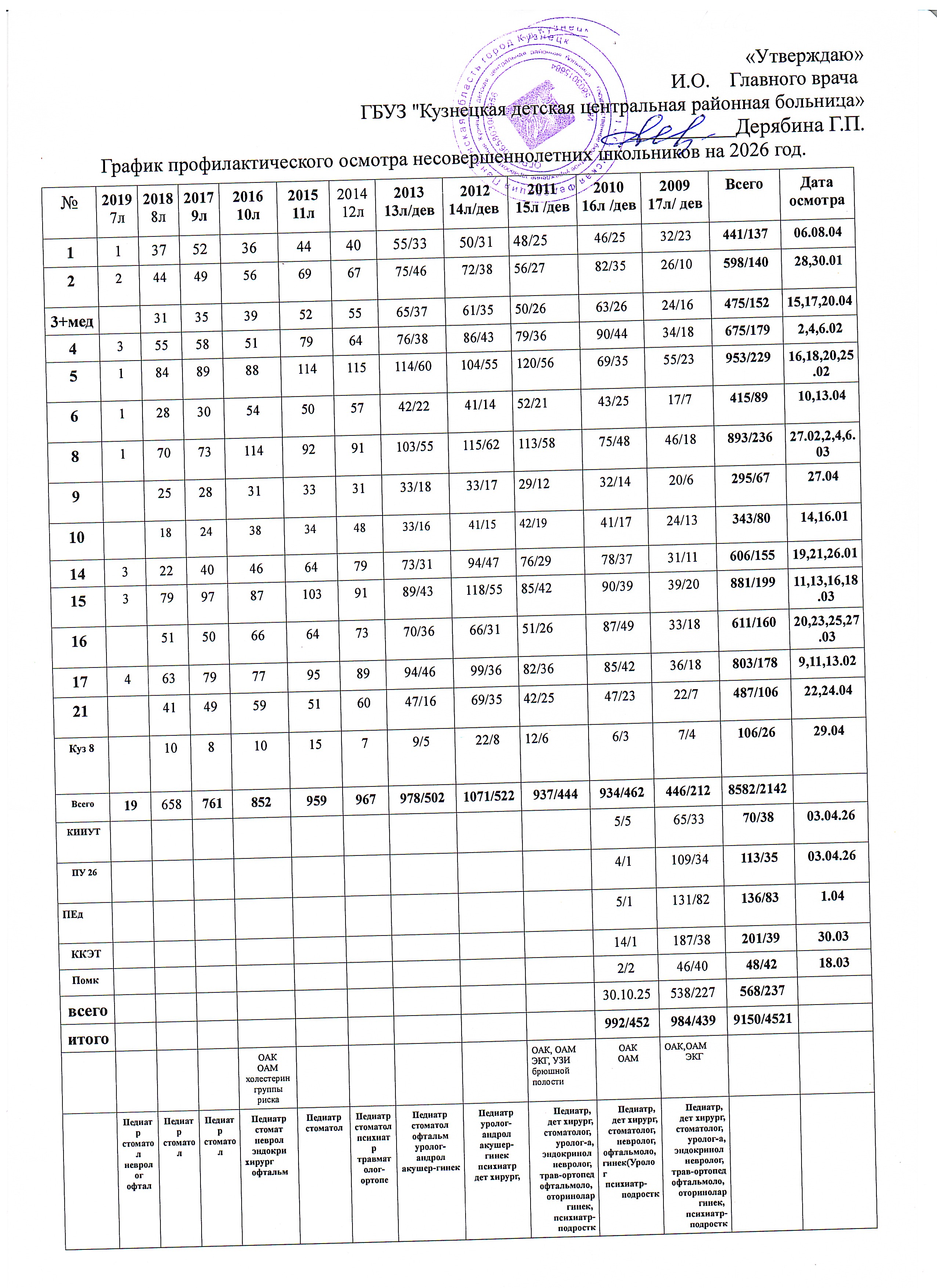 - График профилактических осмотров несовершеннолетних по Кузнецкому району в 2023 году