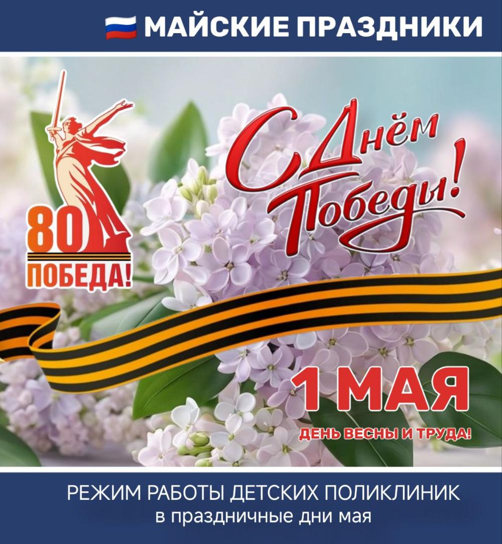 Уважаемые родители наших пациентов! В период майских праздников — с 1 по 4 мая и с 8 по 11 мая 2025 года — детское лечебное учреждение продолжит работать, чтобы обеспечить ваших детей своевременной медицинской помощью.